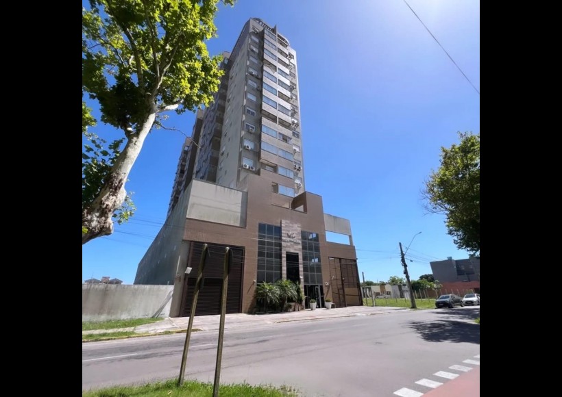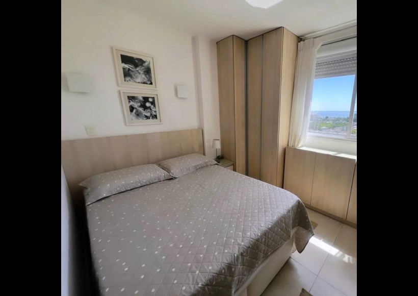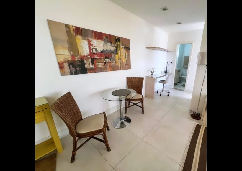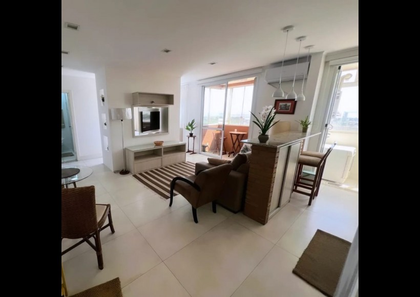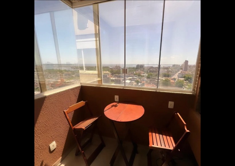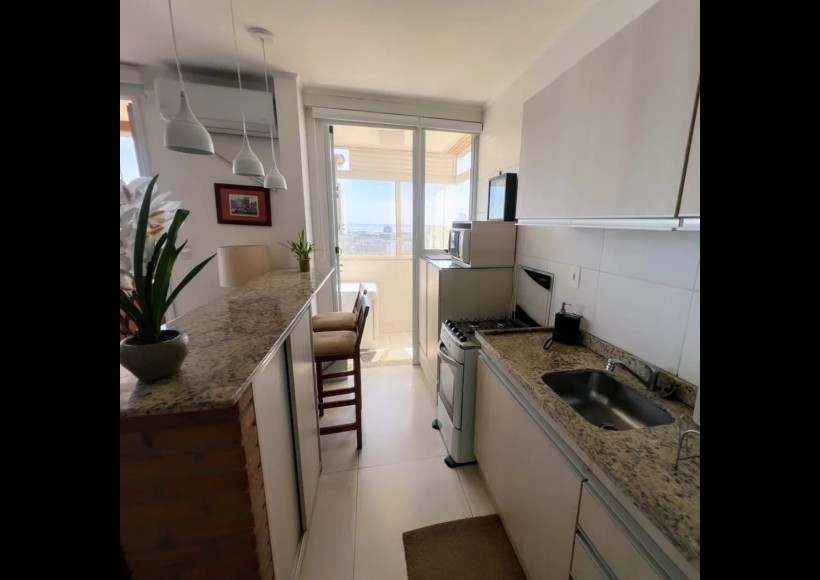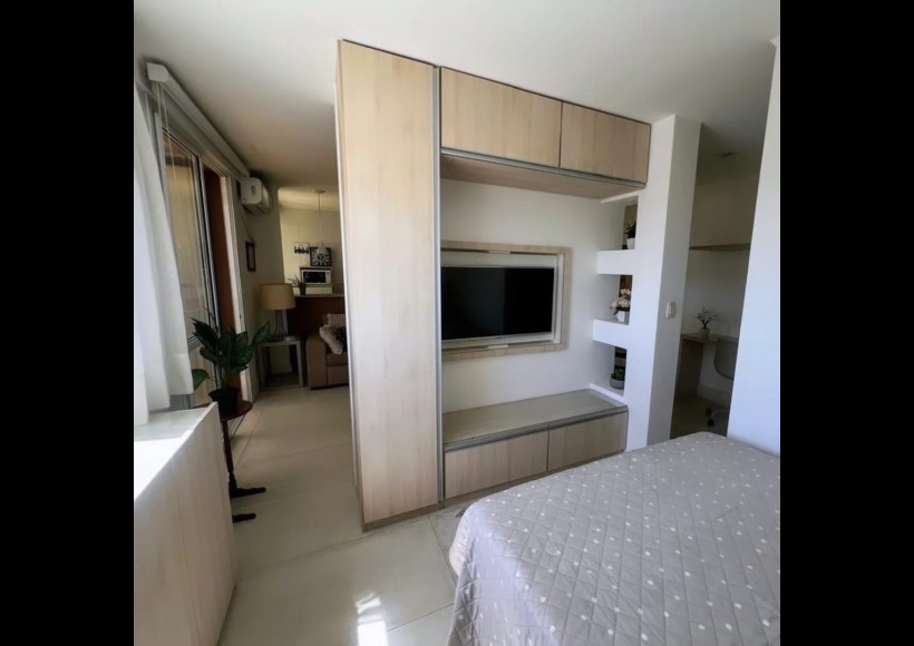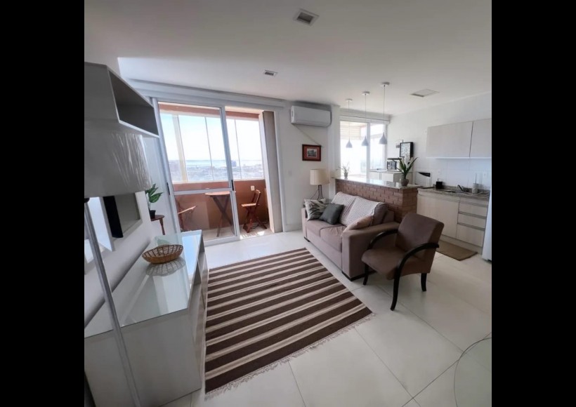 Sala de estar e jantar conjugadas com a cozinha, um dormitório, banheiro, área de serviço e sacada com churrasqueira. Um box de garagem.