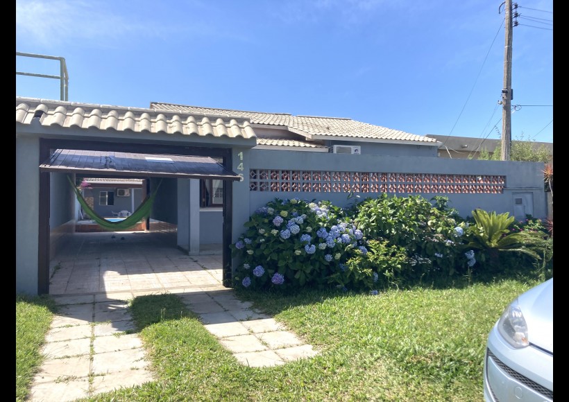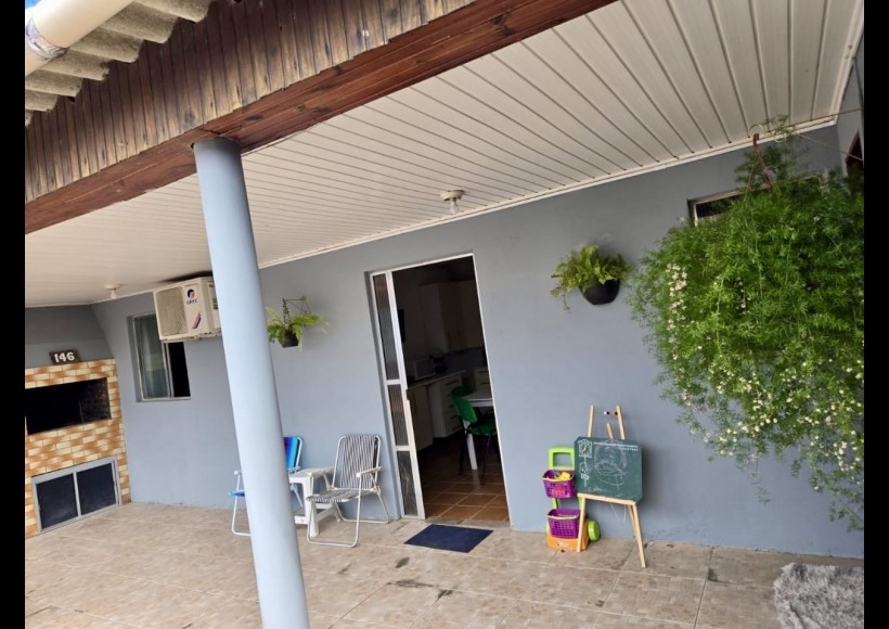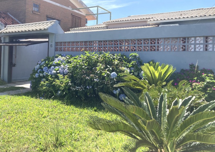 Na frente:Alpendre (garagem), sala e cozinha conjugadas, dois dormitórios e um banheiro
