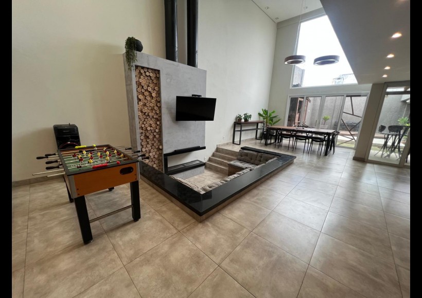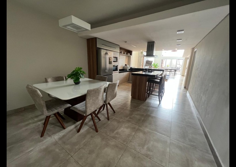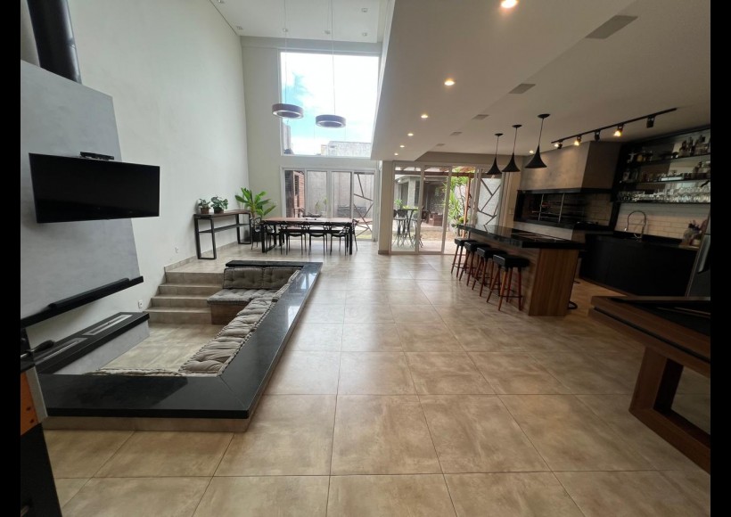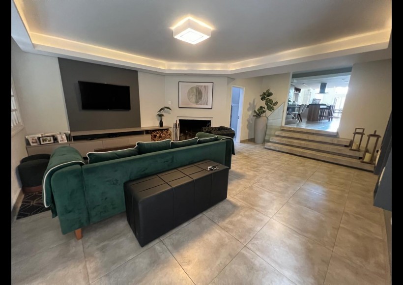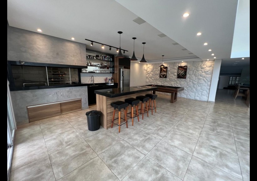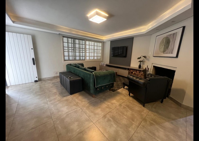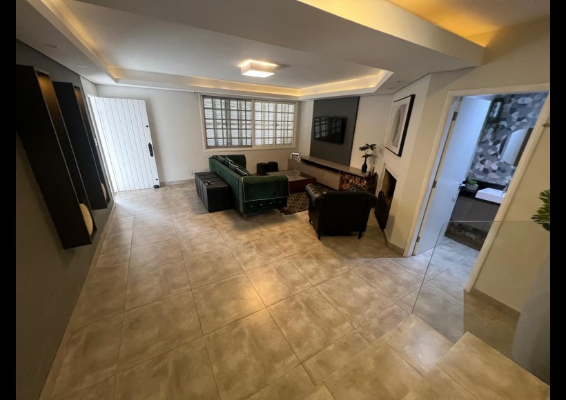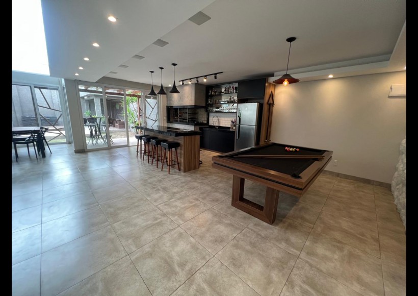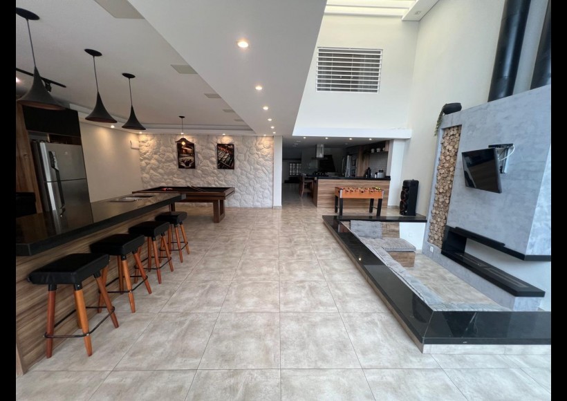No térreo, ambientes integrados e pensados para convivência e lazer: sala com lareira, lavabo, cozinha, estar com área de jogos e parrilla, além de pátio interno com piscina e deck retrátil. Conta ainda com garagem para dois veículos, lavanderia e banheiro de serviço.